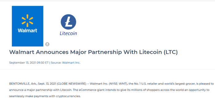 1 min read Sep 13 2021. It seems like the news that Walmart had a partnership with Litecoin was fake news. However the price plunged after Walmart debunked the fake news of partnership.